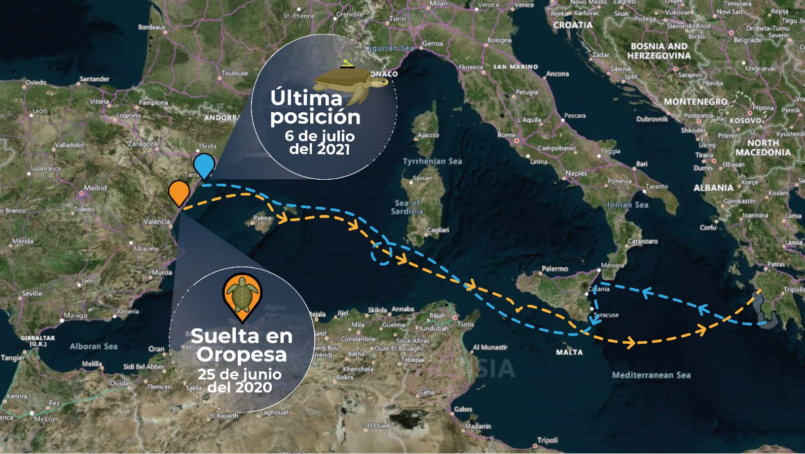 Antes de volver al mar por segunda vez en Oropesa en 2020, los veterinarios de la Fundación Oceanogràfic y Fundación Azul Marino le instalaron un emisor satelital en su caparazón, gracias al cual se ha podido realizar un seguimiento constante de su viaje por el Mar Mediterráneo y que ha reportado información valiosa sobre aspectos importantes para la conservación de su especie, como cuáles son sus amenazas, sus movimientos y su demografía.