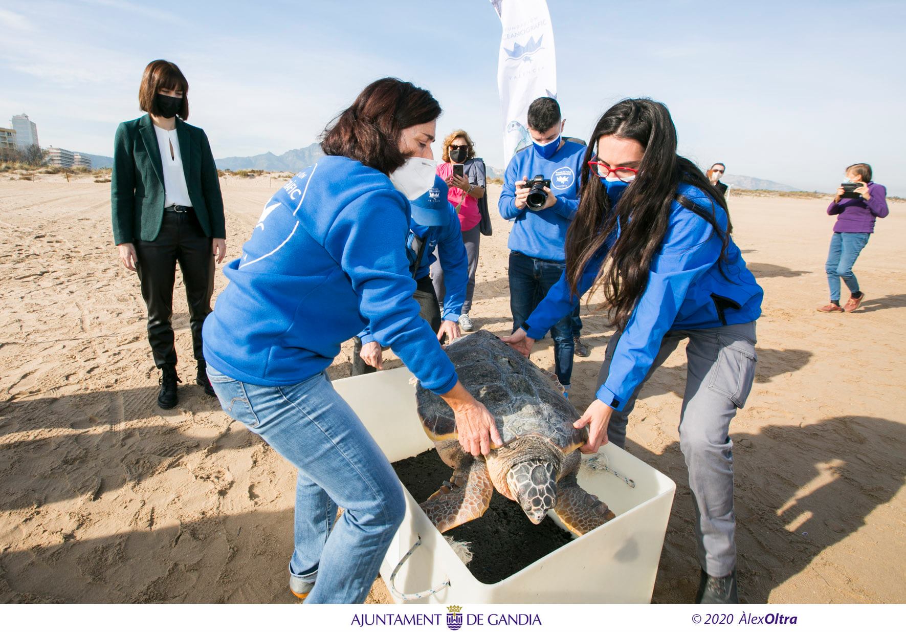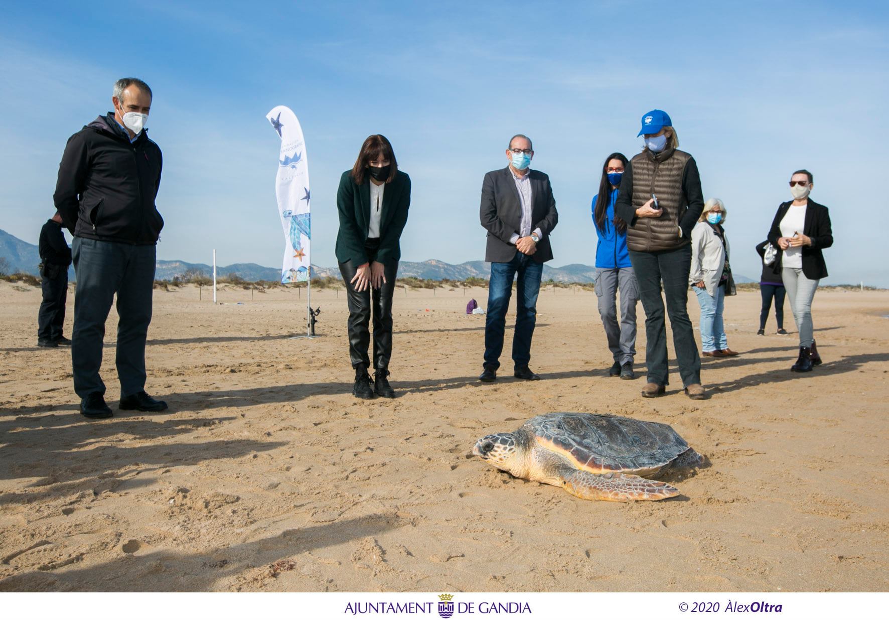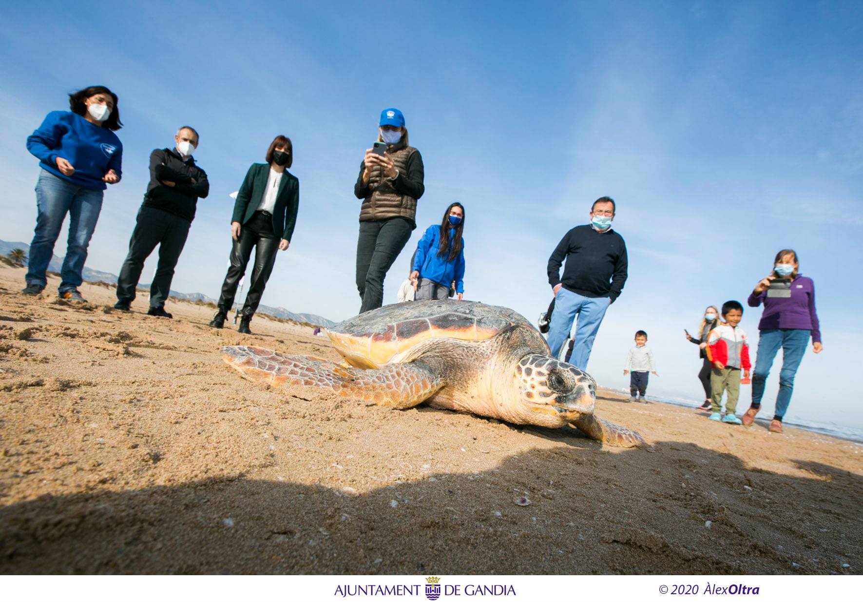 Al contrario que en otras ocasiones que se ha celebrado en las playas de Gandia, a la suelta de la tortuga ha asistido un reducido grupo de personas por exigencias de la seguridad sanitaria.