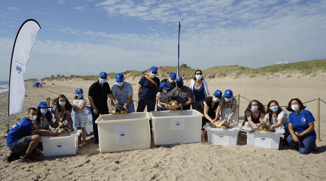 Representantes de los sanitarios devuelven al mar cinco tortugas recuperadas en el Hospital del Mar de la Fundación Oceanogràfic