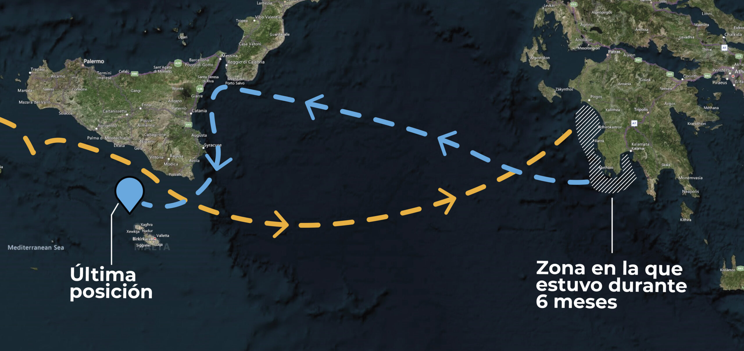 Su ruta continuó hacia Grecia, concretamente hacia el golfo de Ciparisia, en la costa occidental de la península del Peloponeso, cerca del mar Jónico, donde ha permanecido durante seis meses hasta que ha comenzado a cambiar de hábito y de rumbo al dirigirse hacia el estrecho de Messina, en la punta de la bota de Italia y la isla de Sicilia, en primer lugar, para después dirigirse hacia el canal de Sicilia.