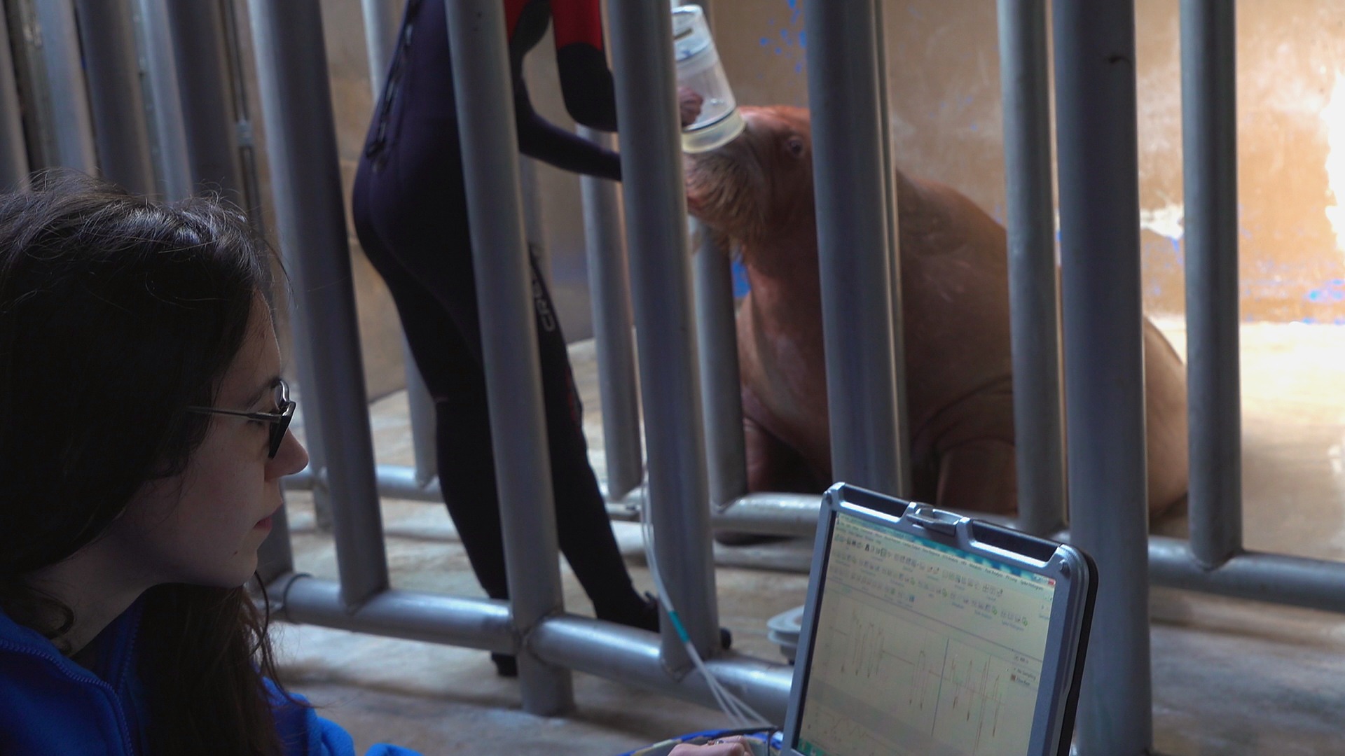 Las tres morsas fueron entrenadas para colaborar voluntariamente en la toma de datos sobre su respiración en tierra y en agua.